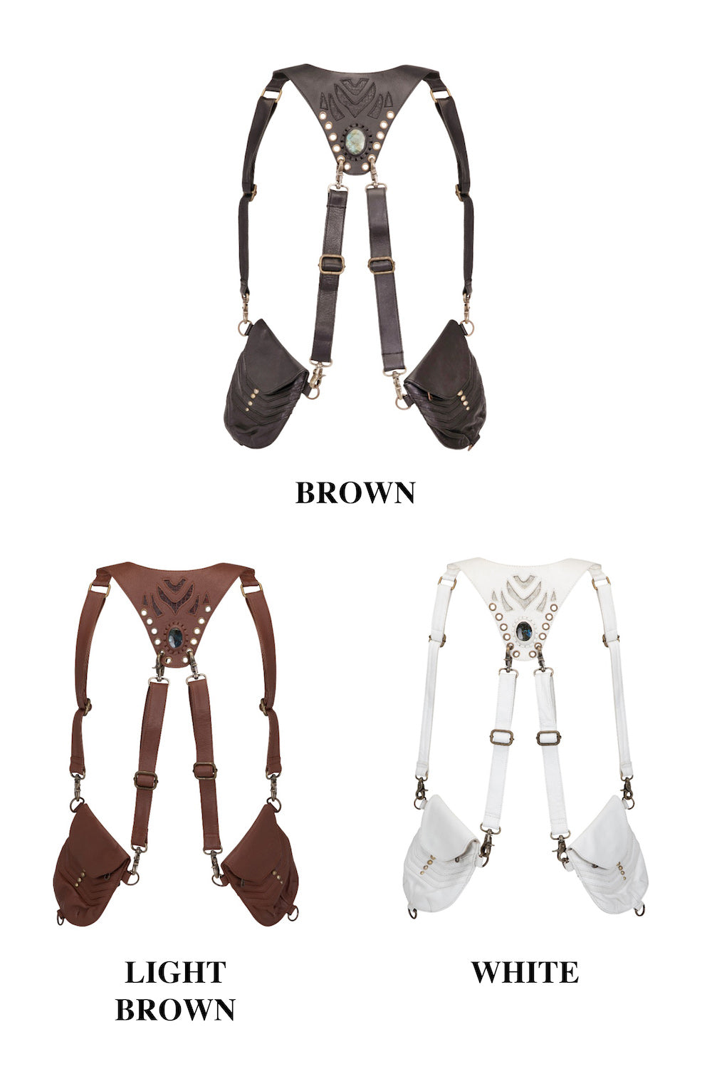 A BEAUTIFUL LABRADORITE STONE IS USED FOR THE HOLSTERS.